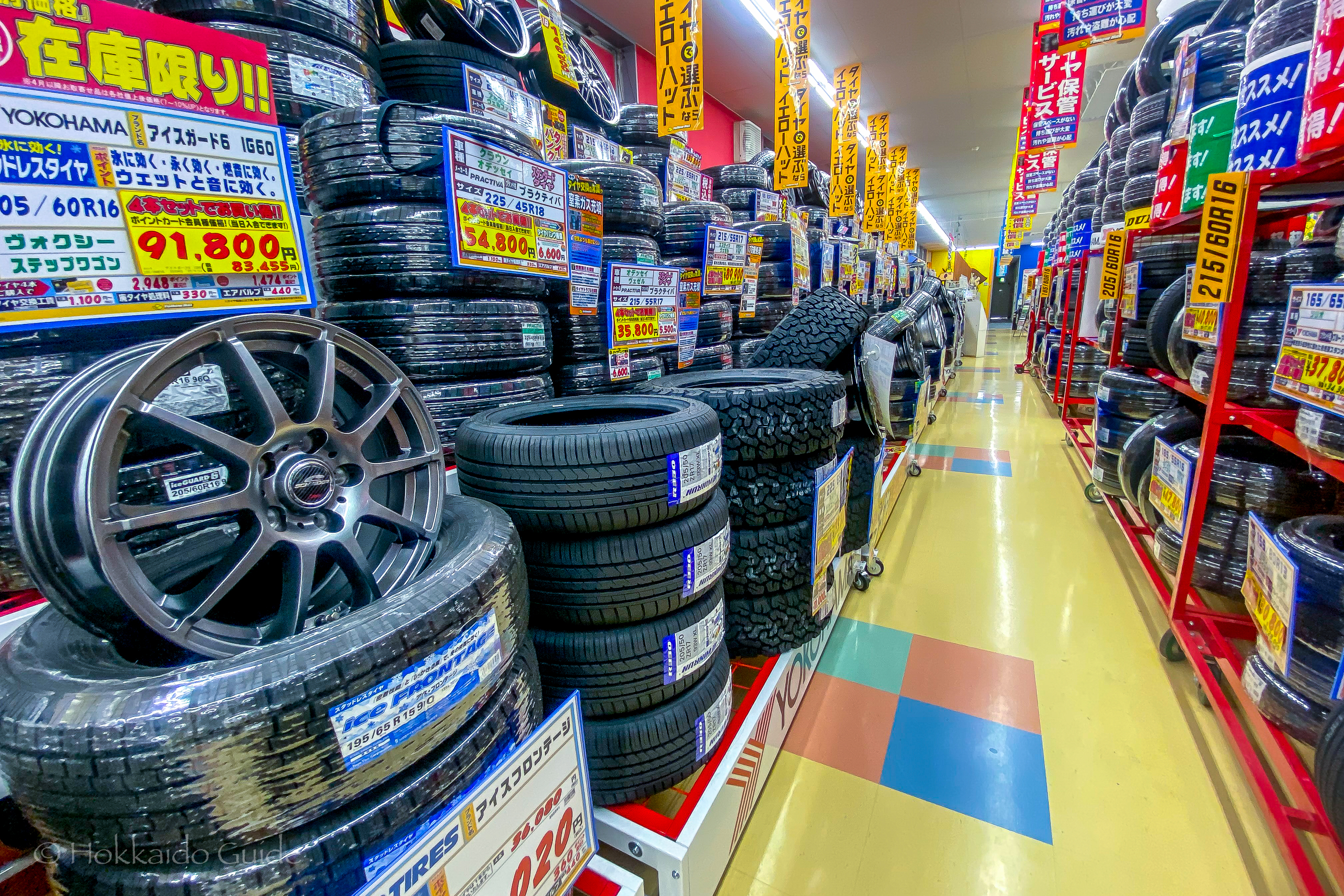 There are hundreds of Yellow Hats throughout Hokkaido. You can find at least two or three Yellow Hats in every main city and town throughout Hokkaido. This chain is nationwide and was founded back in 1960. There are around eight hundred stores nationwide. Yellow Hat caters to automobiles and offers services in car repairs and car goods. If you are looking for anything to upgrade your car or any goods for your interior, you can find it all at Yellow Hat. If you go to their website then you can search for your car model and find items that will fit to that particular model. They have an extensive collection of spoilers, rims, bumpers and tires. If you are looking for brand new tires then this is a good store to take a look at.