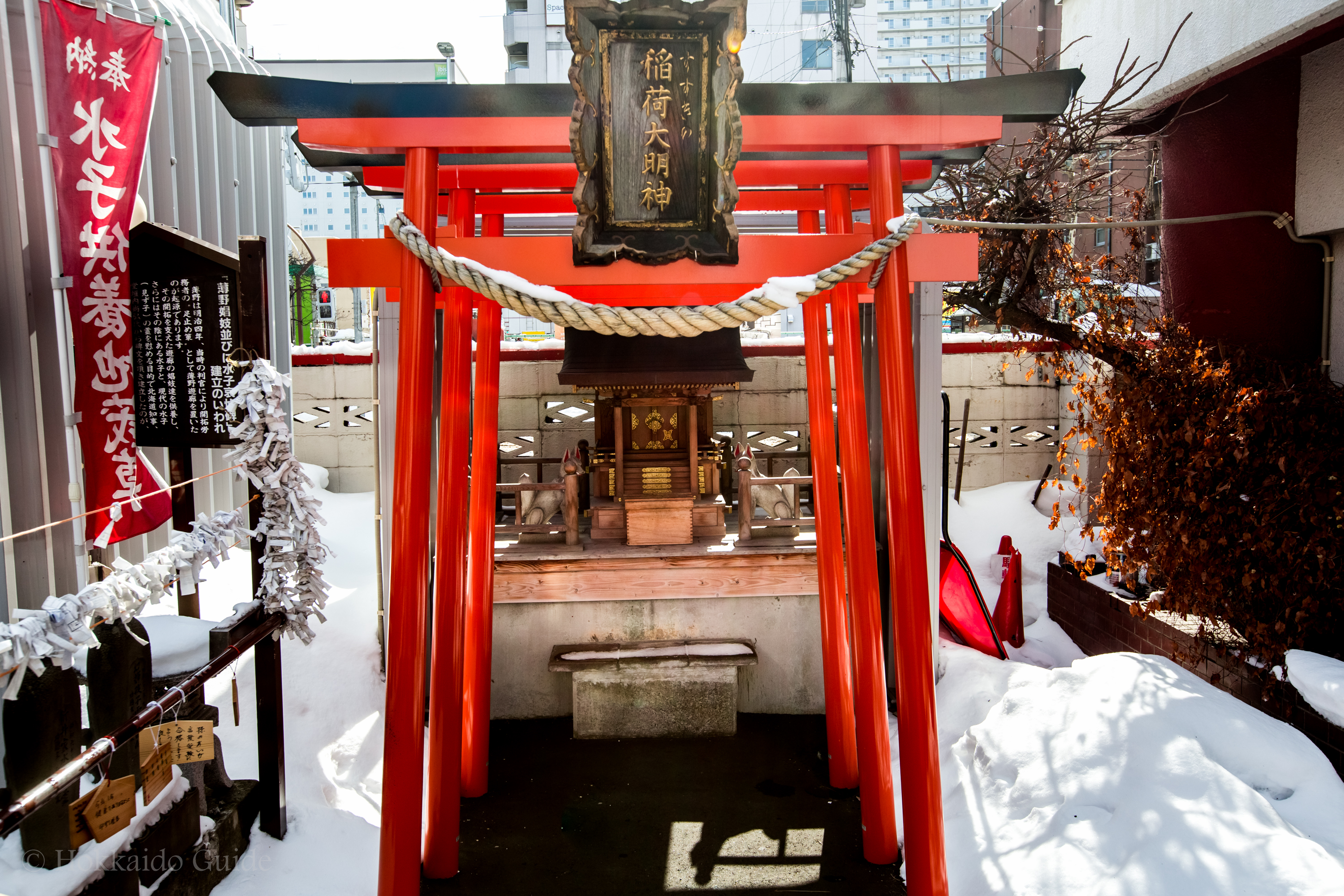 The shrine is said to have “watched Suzukino’s emotions and sorrows for years, and witnessed its prosperity”. The “gate pillar” has inscriptions of certain geisha during this time. A small garden was maintained in the precincts of the Inari shrine, and upon entering the area on the left you can see the ‘Mizuko Mourning Monument’. This shrine seems to have a sad past concerning children lost at birth. Tama Temple is one of the few remnants of the old days during the period of the shogun of Hokkaido.