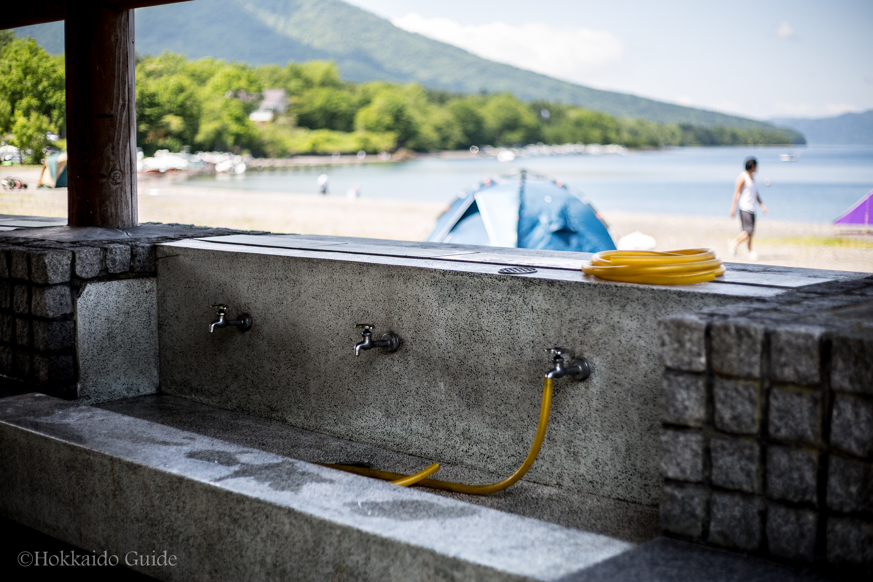 The campsite is along the shore of pebbles of the lake, so something comfortable to sleep on, is advised. Extra equipment is NOT available to rent, ONLY basic BBQ equipment such as grill and coal. All other equipment must be supplied by yourself. Other facilities include toilets that are well kept, a restaurant during the day, vending machines, and the rental shop.