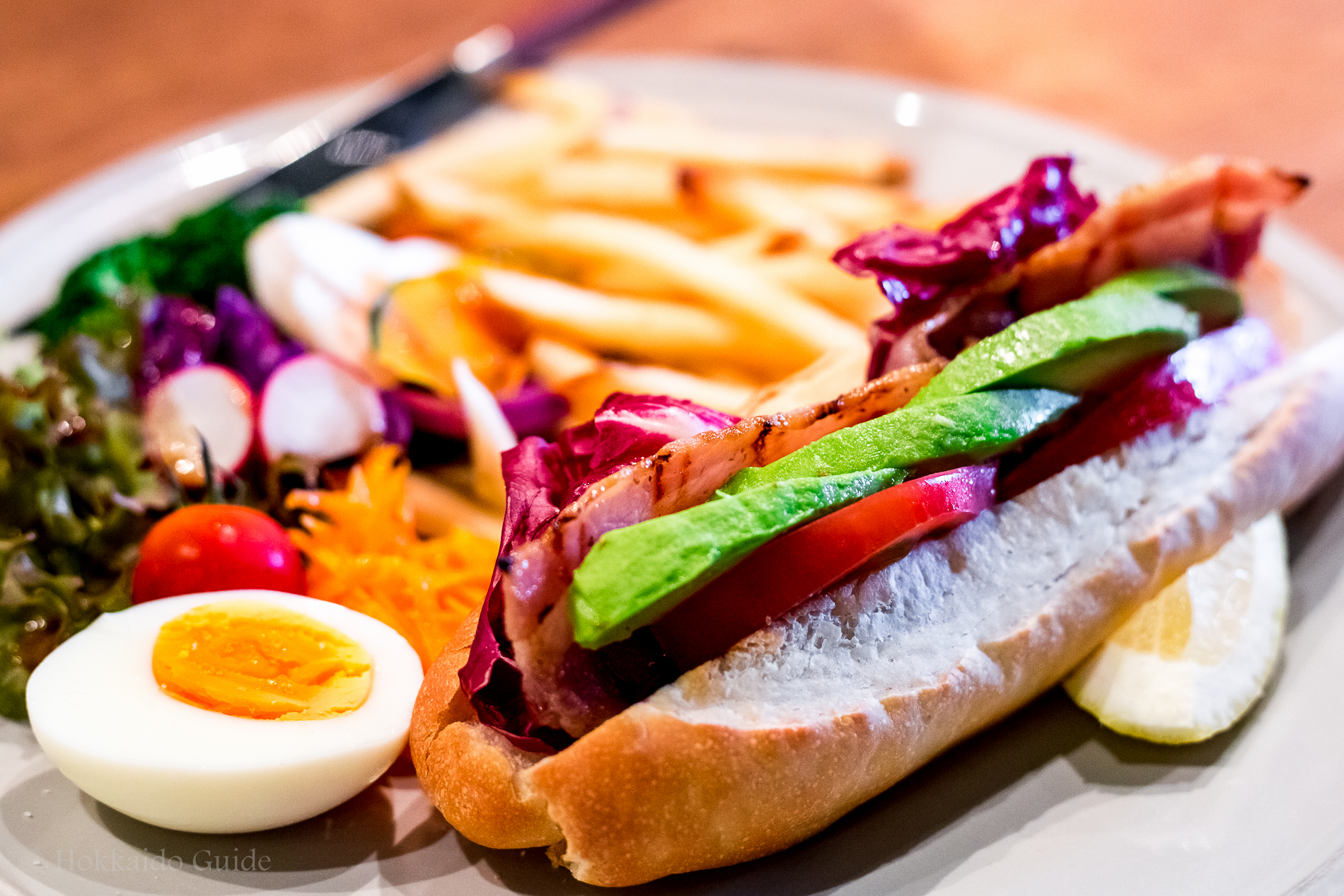 Bacon and avocado roll with fries.