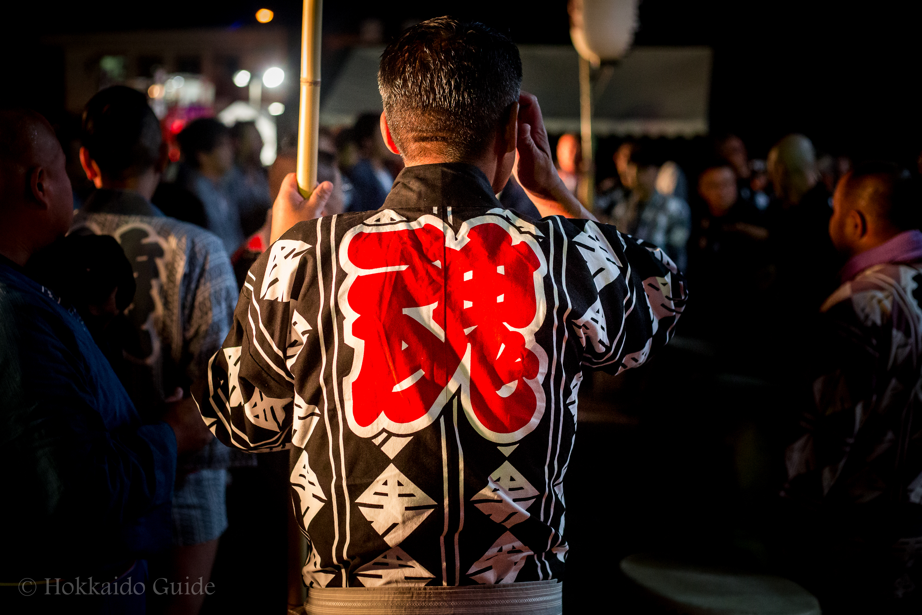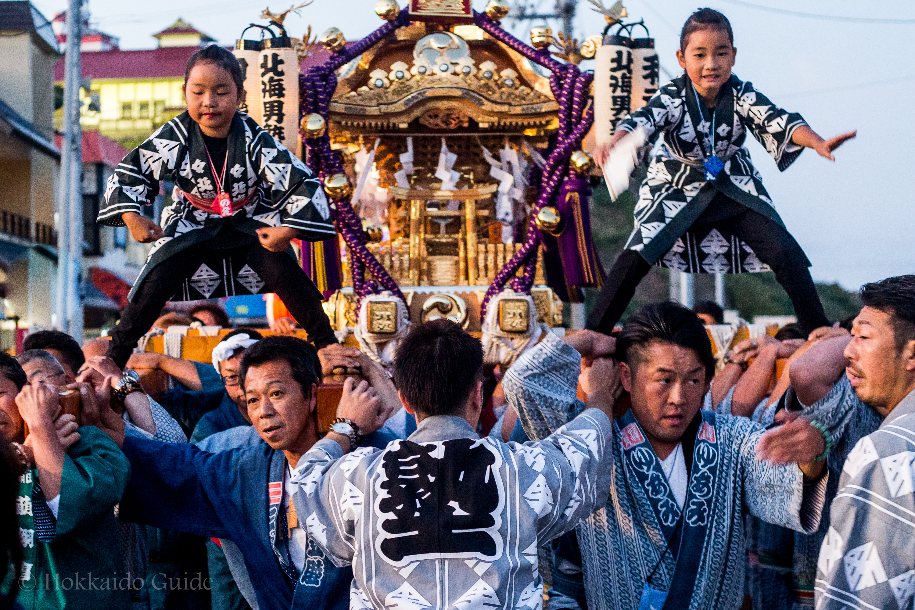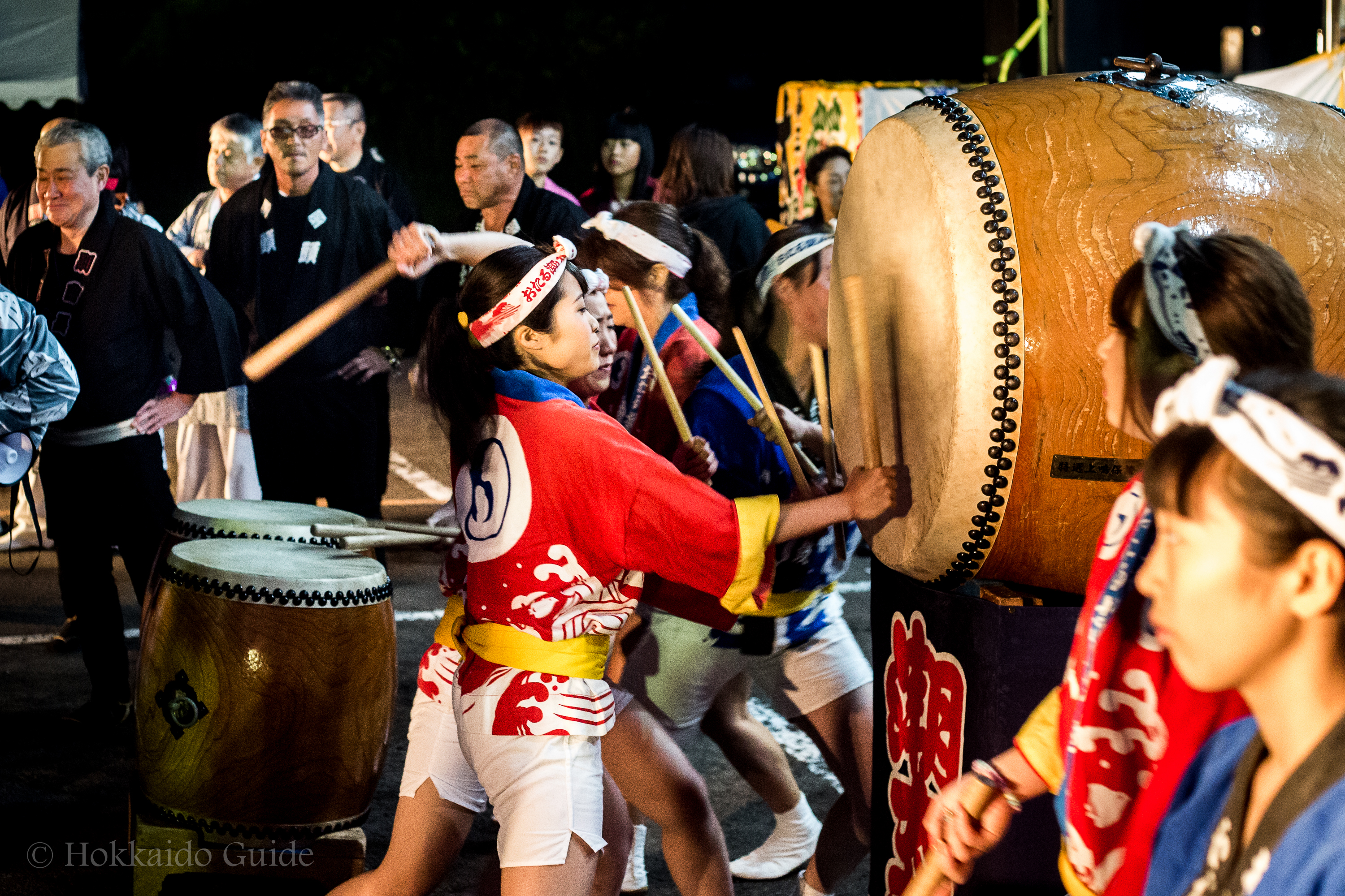 At the start of the festival a portable shrine (mikoshi) is carried in by a large group of participants. These group of shrine bearers get together every year, and are from Sapporo and a few outlying towns. Chanting and singing to the rhythm the shrine is slowly brought into the festival. Once the shrine is in the festival it is placed in front of a dozen Taiko performers hitting the drums in time with the chanting. The drums with the shrine gives this festival a great Japanese atmosphere!