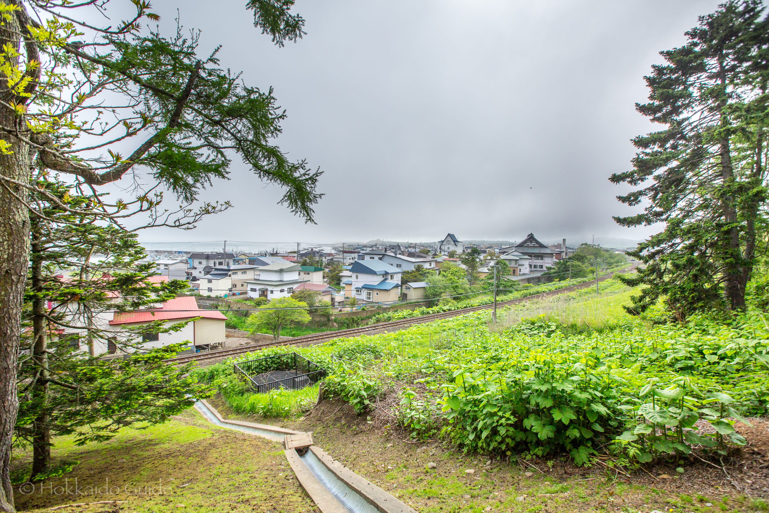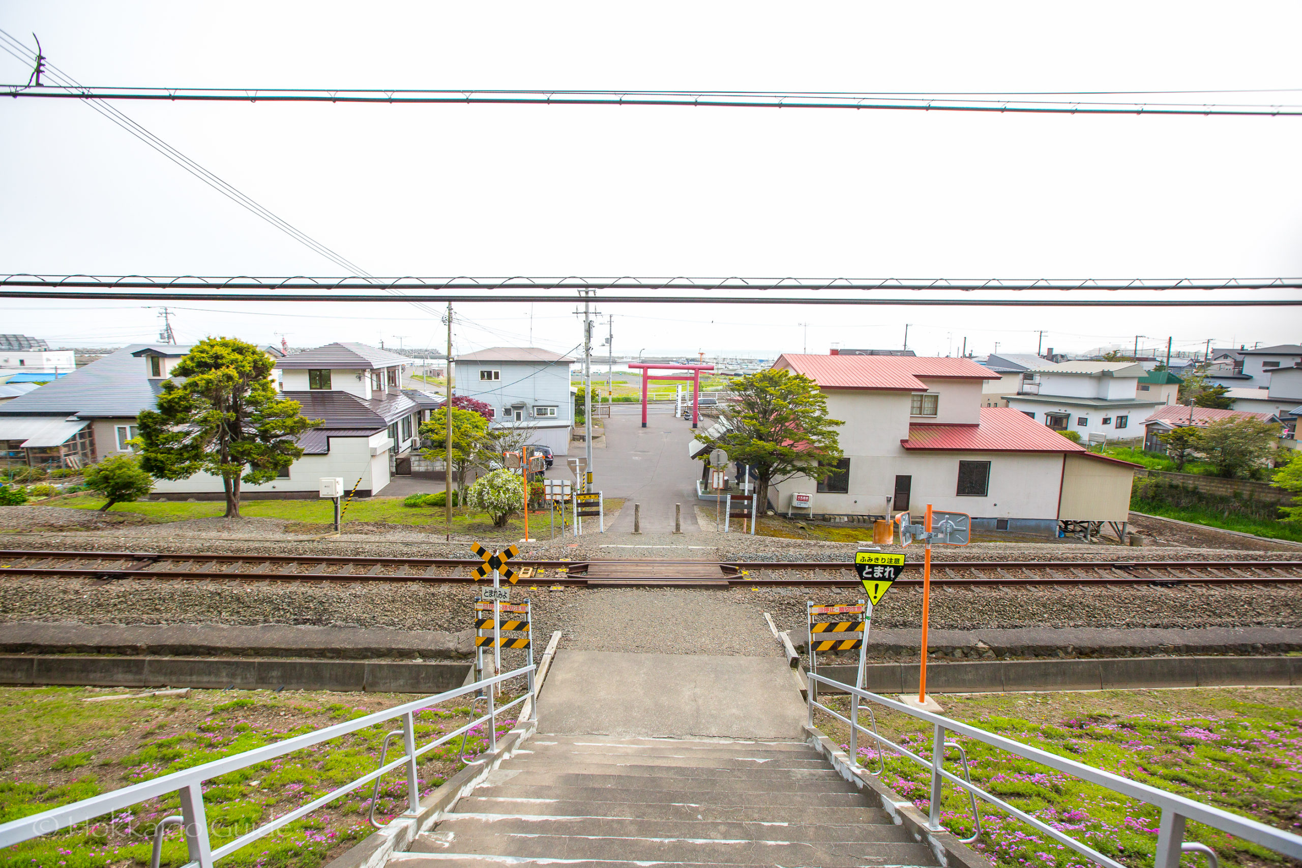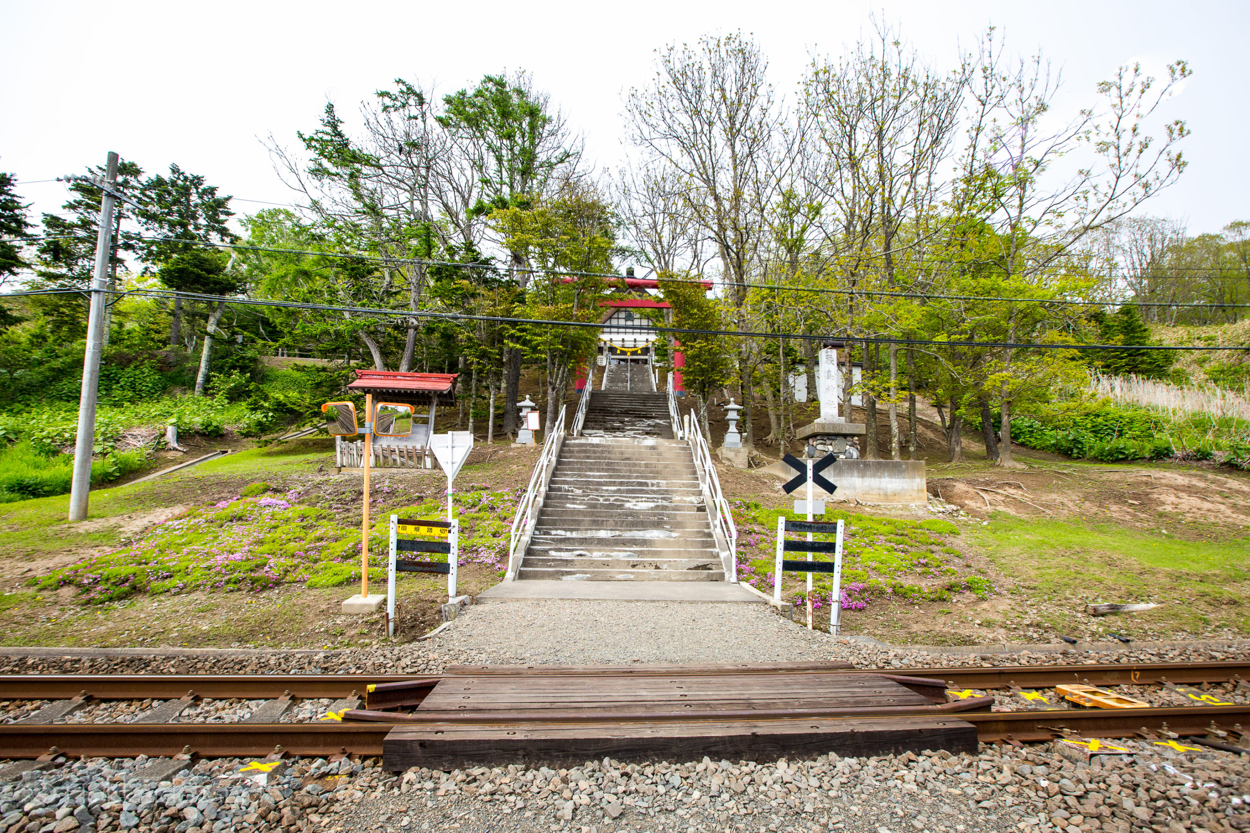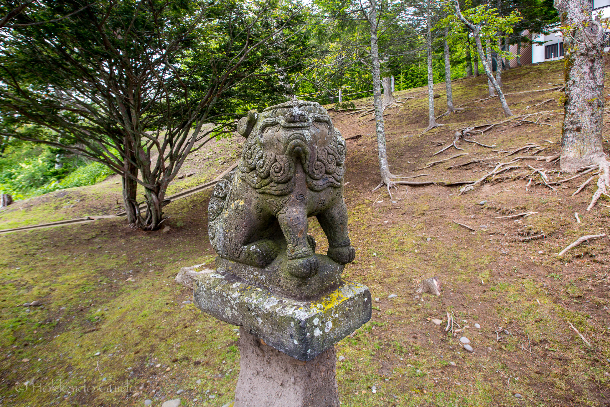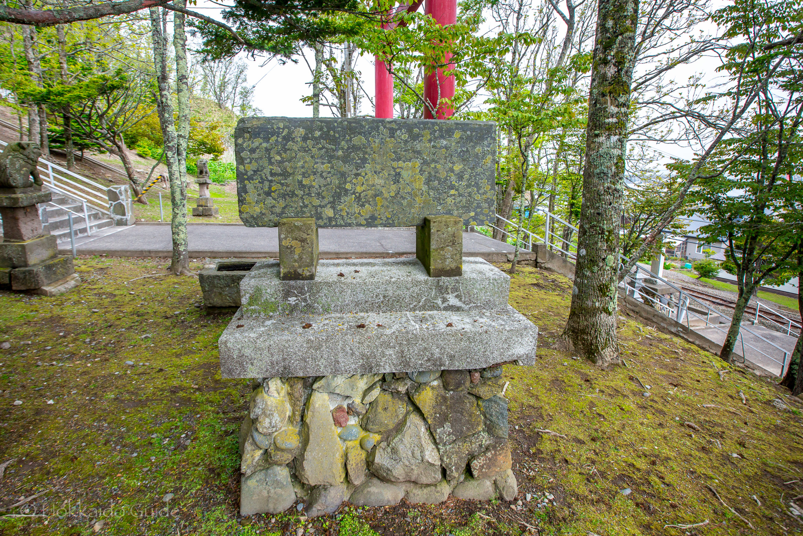 From the bottom of the hill, it is small walk up to the shrine itself. It only takes a couple minutes. Interestingly, to get to the shrine, travelers and worshippers alike need to walk over the train tracks to get to the steps. So check for trains! Once at the shrine, it has nice views of the town of Shiranuka including the ocean if the weather is good. There is a small wood area plus small shrines and Komainu (the lion dog guardians) that are in various places on the grounds.