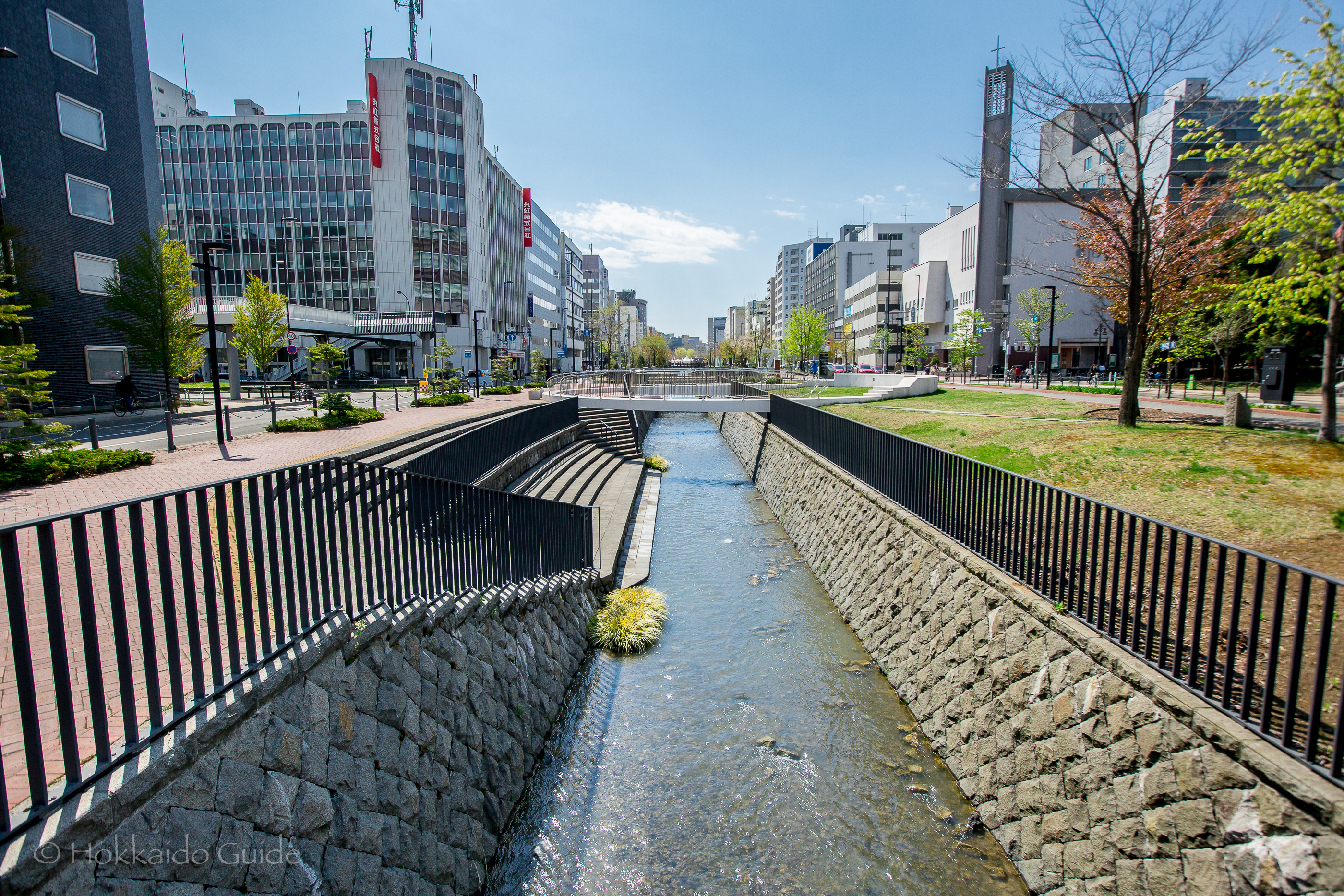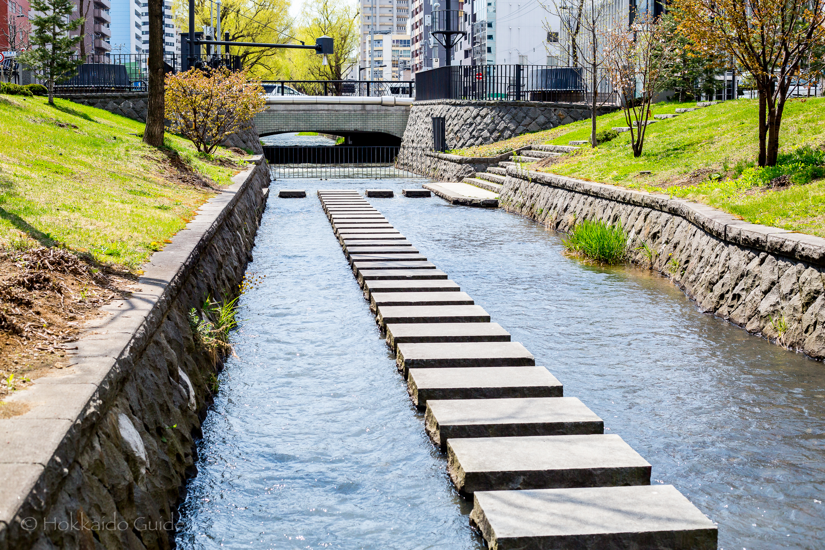 Soseigawa Park can be found in central Sapporo, and runs from north to south, for 820 meters. It’s a pleasant place to take a stroll along the narrow river that runs through the centre of the park. The Sosei bridge crosses through the centre of the park, and is said that the history of Sapporo started at the very foot of this bridge. A statue of Otomo Kametaro, who first excavated the canal in 1869, can be found here. The park was redesigned and completed in 2011 with amenities, grass area, sculptures, and an underpass was put in.