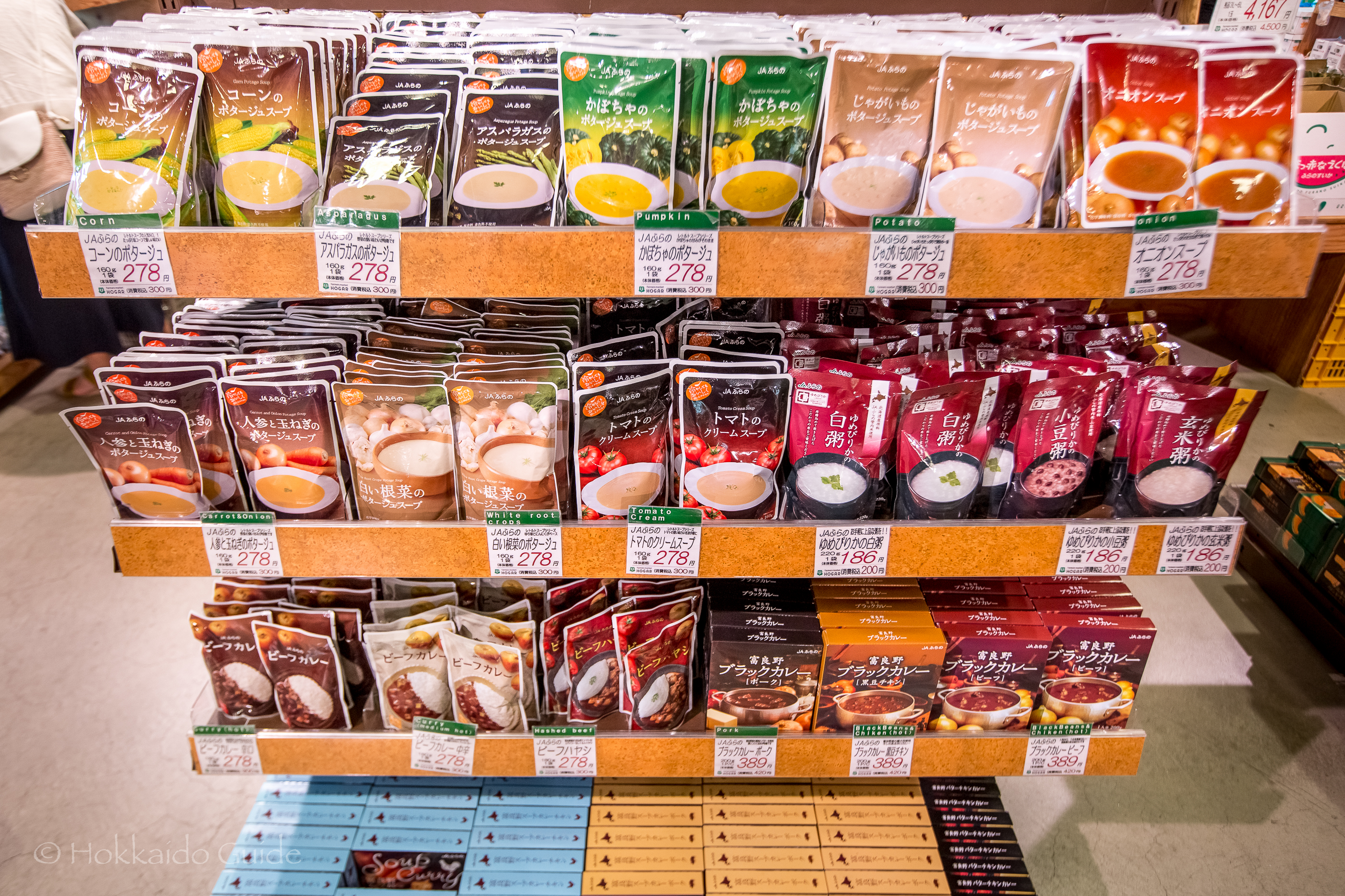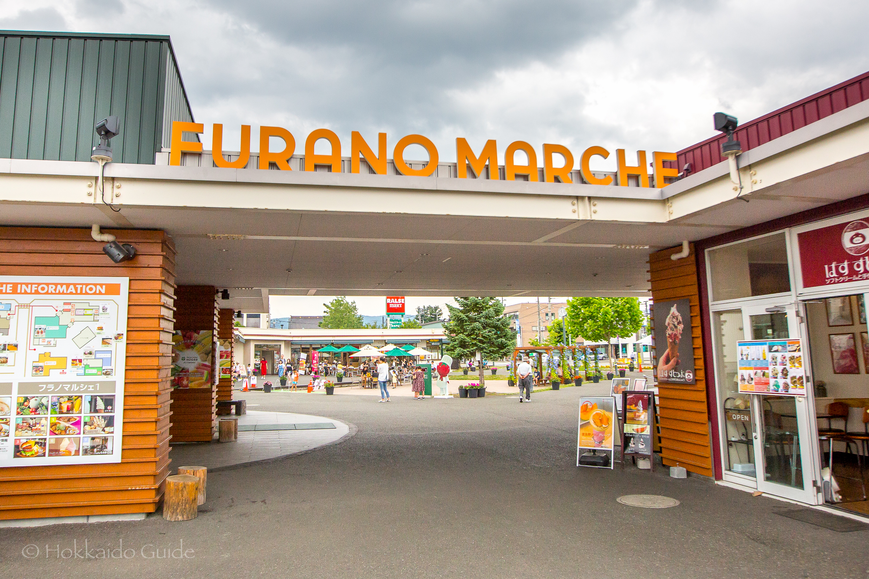 Furano Marche is separated into two different sections, Furano Marche 1 and Furano March 2. They are located on two parallel blocks separated by a small road. Furano Marche 1 has an open plaza in the centre, whereas Marche 2 is a larger building complex. Furano Marche 1 includes a mouth watering burger shop, a cafe, a fresh bread store, a takoyaki (fried octopus snack) shop, a fruit juice counter, a local produce store and souvenir store. The larger building of Marche 2 has a flower store, local souvenir store, a rice ball eatery to take out, a local restaurant, a grocery store, a ramen restaurant, and an ice-sundae eatery.