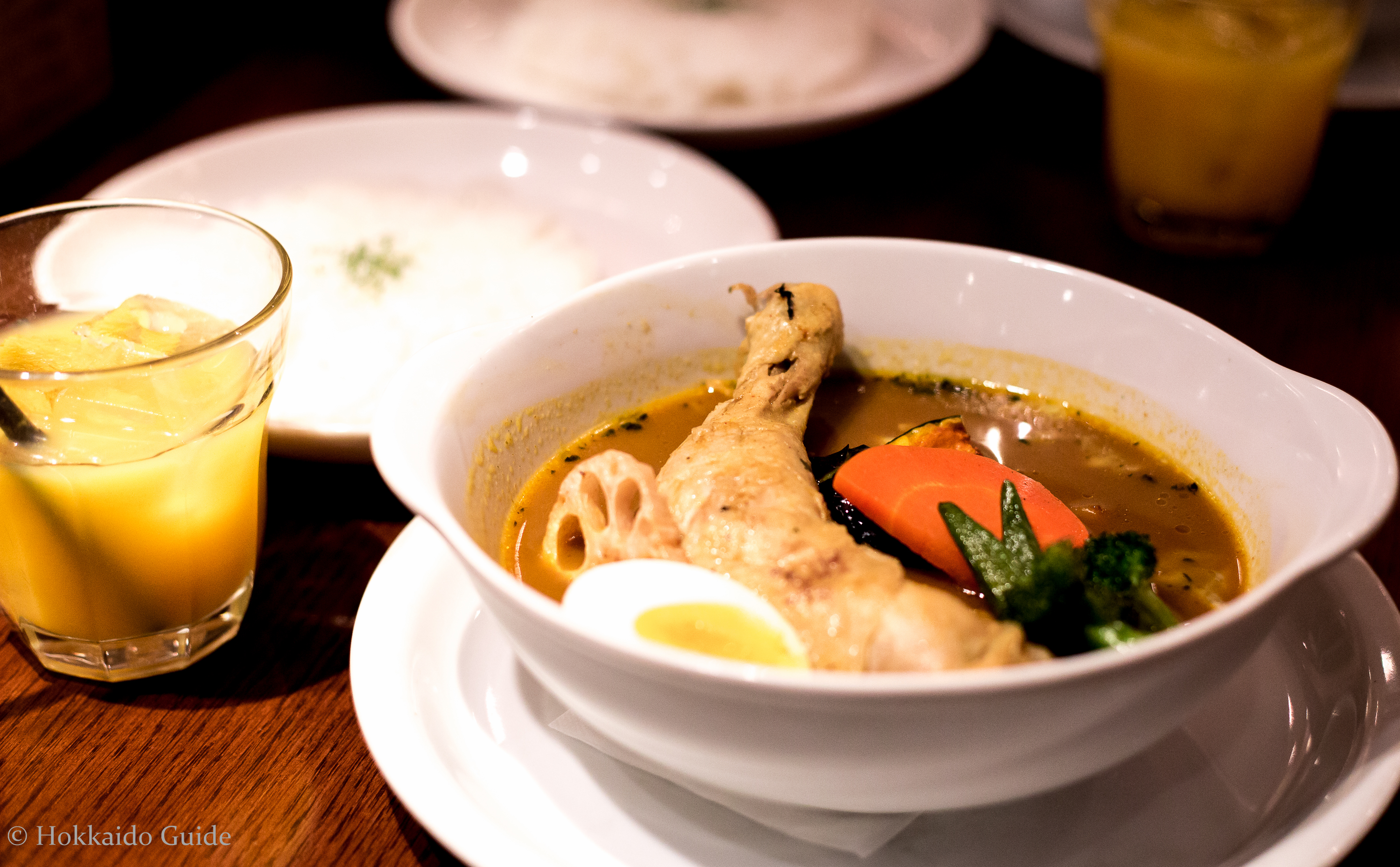 This cosy eatery is located on the 8th Floor of Sapporo PARCO. The staff are polite and very friendly and speak limited English but they will provide an English Menu upon request. The menu includes a vegetable curry, vegetables with chicken, vegetables and pork, mushroom curry, and a seafood curry. The spiciness ranges from one to five. Two being mild, and a safe choice with a slight kick. Assorted vegetables and the selection of meat are in small pieces, and fried before being added to the soup curry in a bowl. Each dish comes with rice and is available in small, medium or large portions.