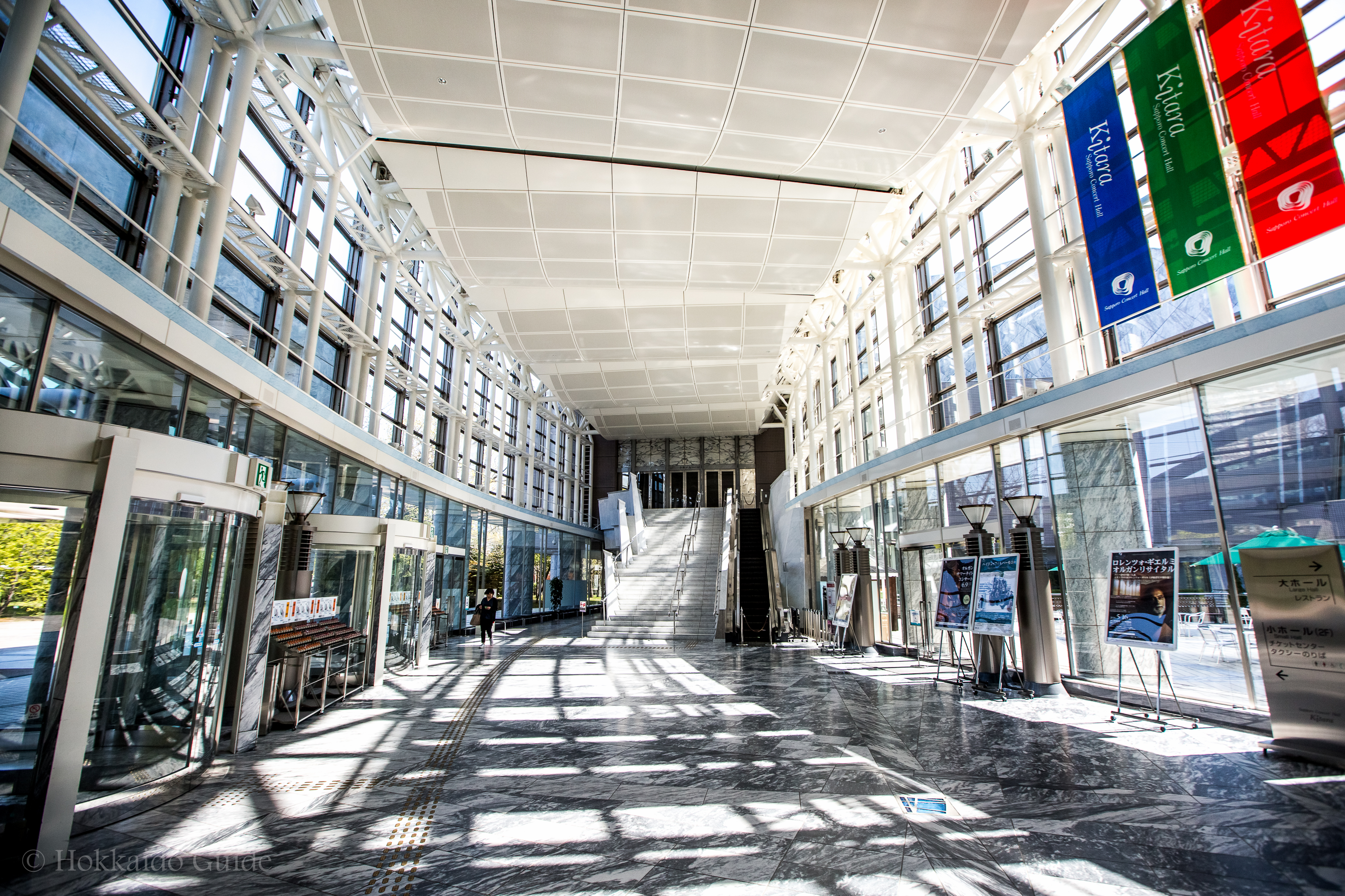 Sapporo Concert Hall, also known as “Kitara”. Opened in 1997, it is the largest concert hall in Hokkaido, and houses a large main hall, small chamber music hall, and rehearsal rooms. A restaurant, nursery room, and museum shop are also located in the building.