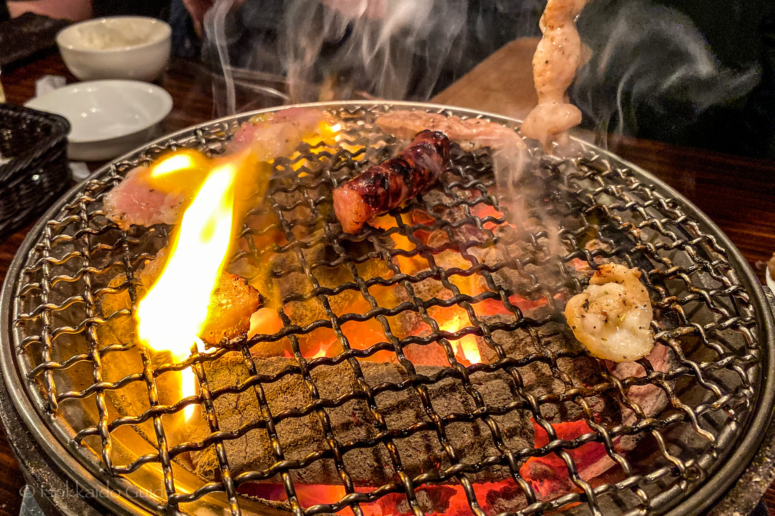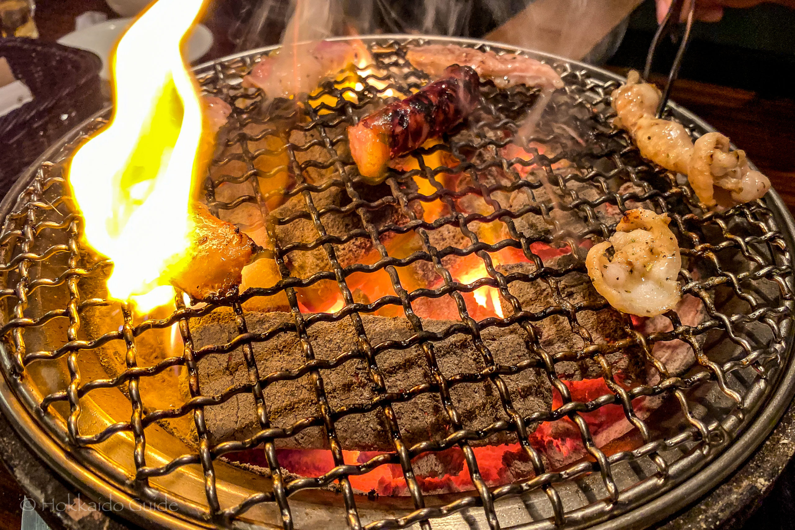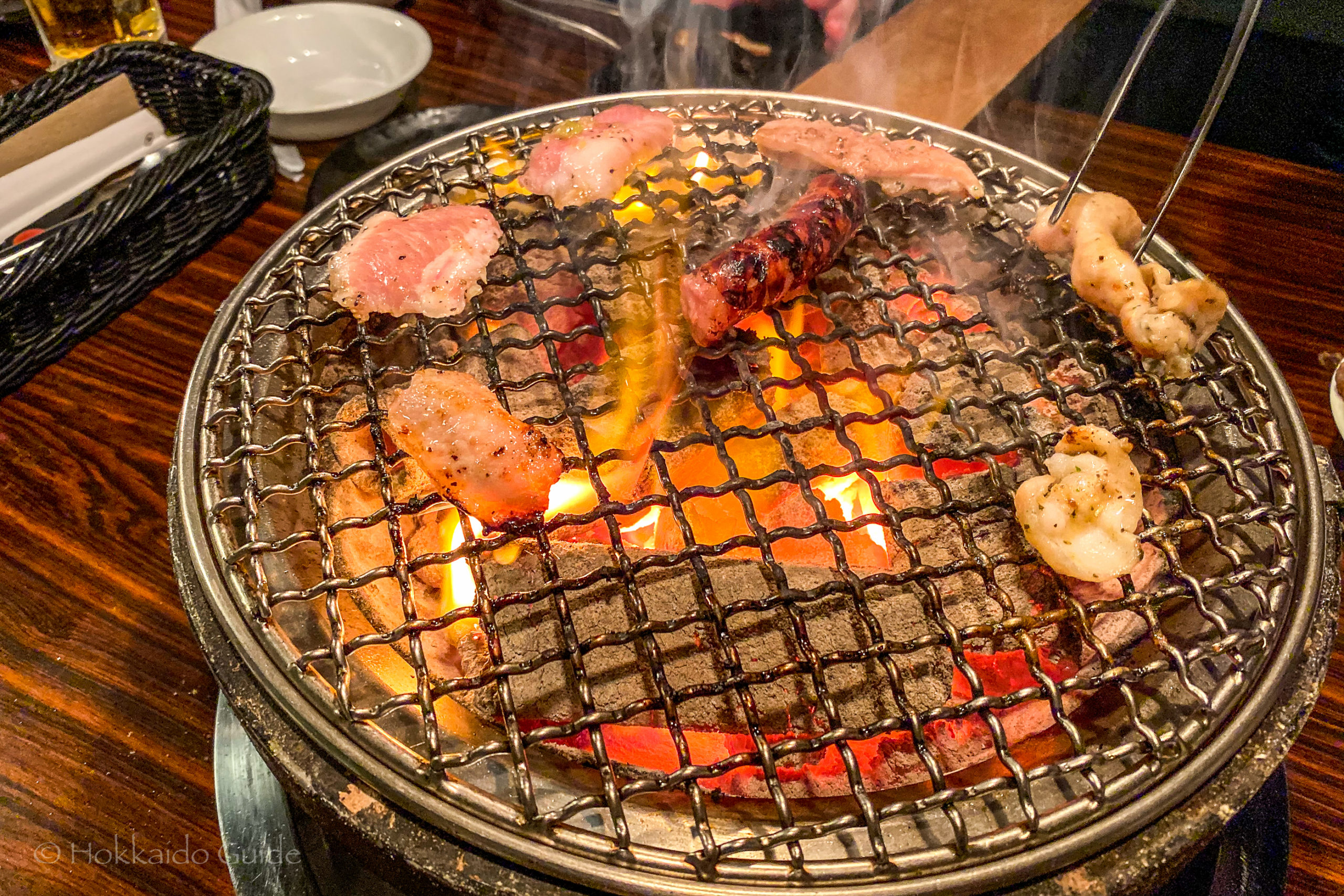 Gaja is a very popular chain of yakiniku restaurants throughout Sapporo and with another location in Obihiro as well. Yakiniku is a unique dining experience where the clientele grill (yaku) their own meats (niku) to their desired taste. The food is cooked on small hot grill that is heated via hot coals. Each grill is located in the center of the tables with an exhaust fan above (so the customers don’t get smoked out). These restaurants are popular for two reasons. First there is a large selection of meat that can be chosen. Different cuts of beef, plus pork, chicken and vegetables. Rice and a variety of sauces are also available.
