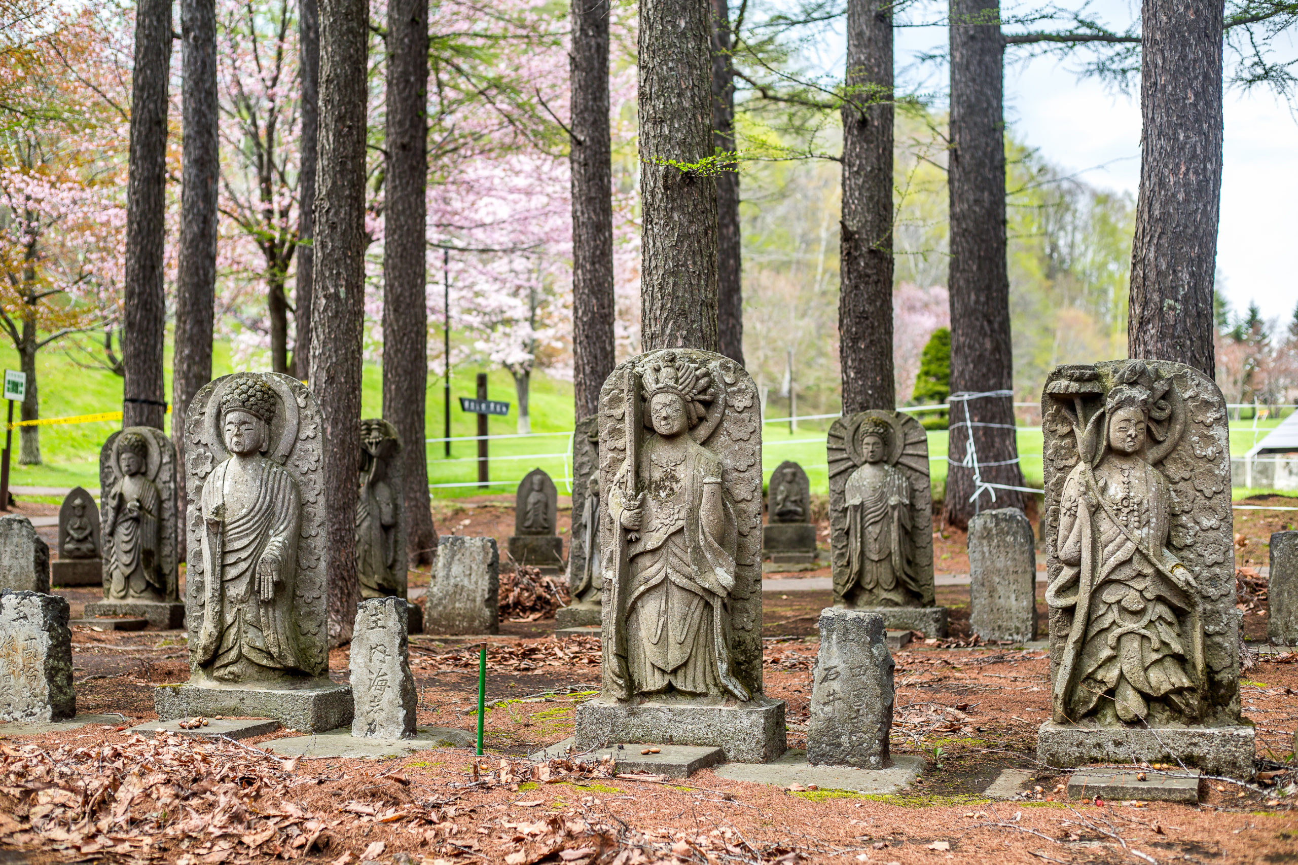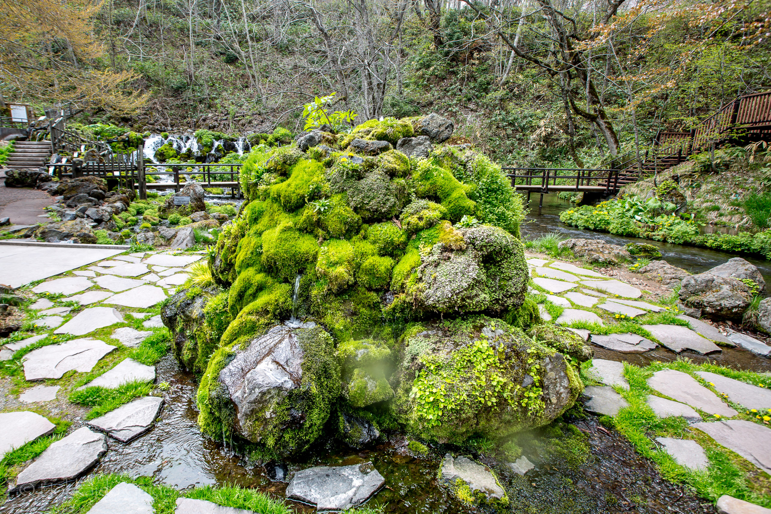 The entrance and parking is at the top of the park. Here, there is lush grasslands, and a play area for the kids. During the spring, you can find beautiful cherry blossoms here. There is also a large log cabin from the parking lot which serves as a souvenir store and restaurant. Following the numerous winding paths you can find a nice grove with stone effigies among the trees. Down the bottom, at the water collection point, there is a small lake plus a restaurant to enjoy a lunch overlooking the streams. Fukidashi Park is gorgeous in all seasons and the water here is crisp and fresh, so be sure to take some home with you!
