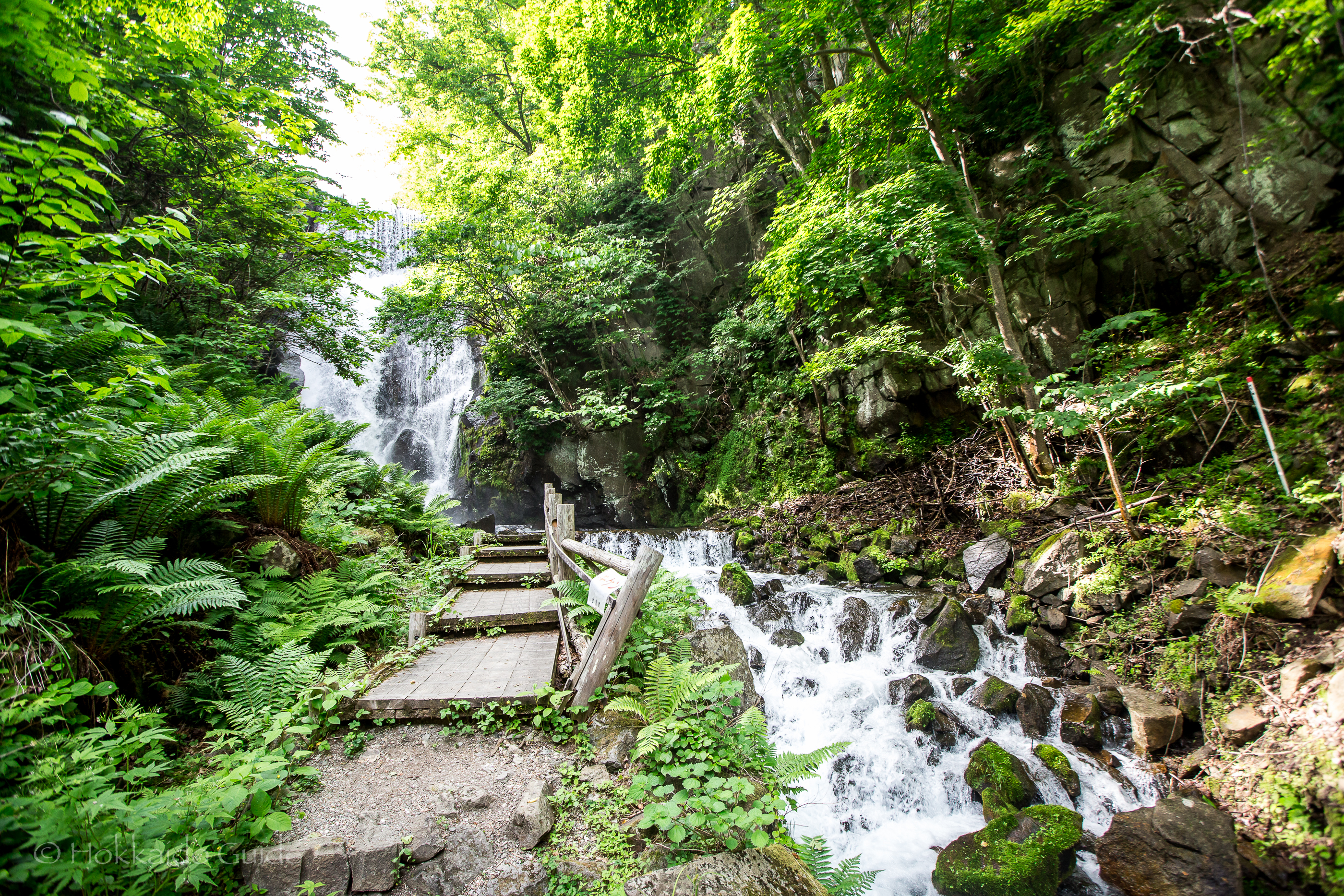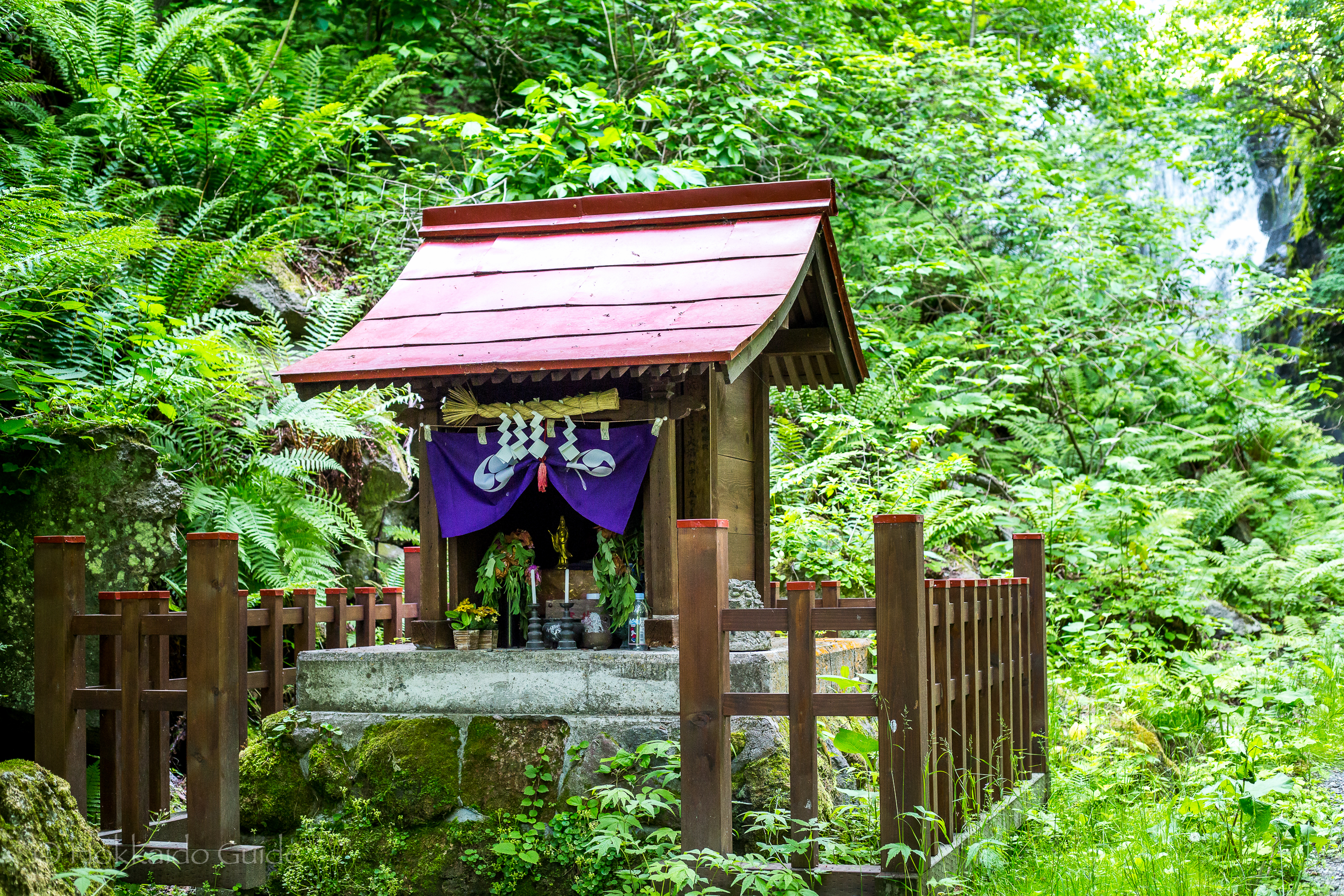 The walk to the waterfall is a nice stroll and it takes about 8 minutes to get there. On the way you can enjoy the flowing stream and the surrounding trees creating a picturesque scene. The path crosses over the river twice over small bridges. On the way to the falls you can also find a small Buddhist Shrine on the left. With the falls in the background, this small shrine is also a good spot to get some photos. The path reaches a small wooden viewing platform about 10 metres from the falls. This wooden platform can get slippery so make sure you hold on to the rail. Sobetsu Waterfall is a beautiful spot to visit.