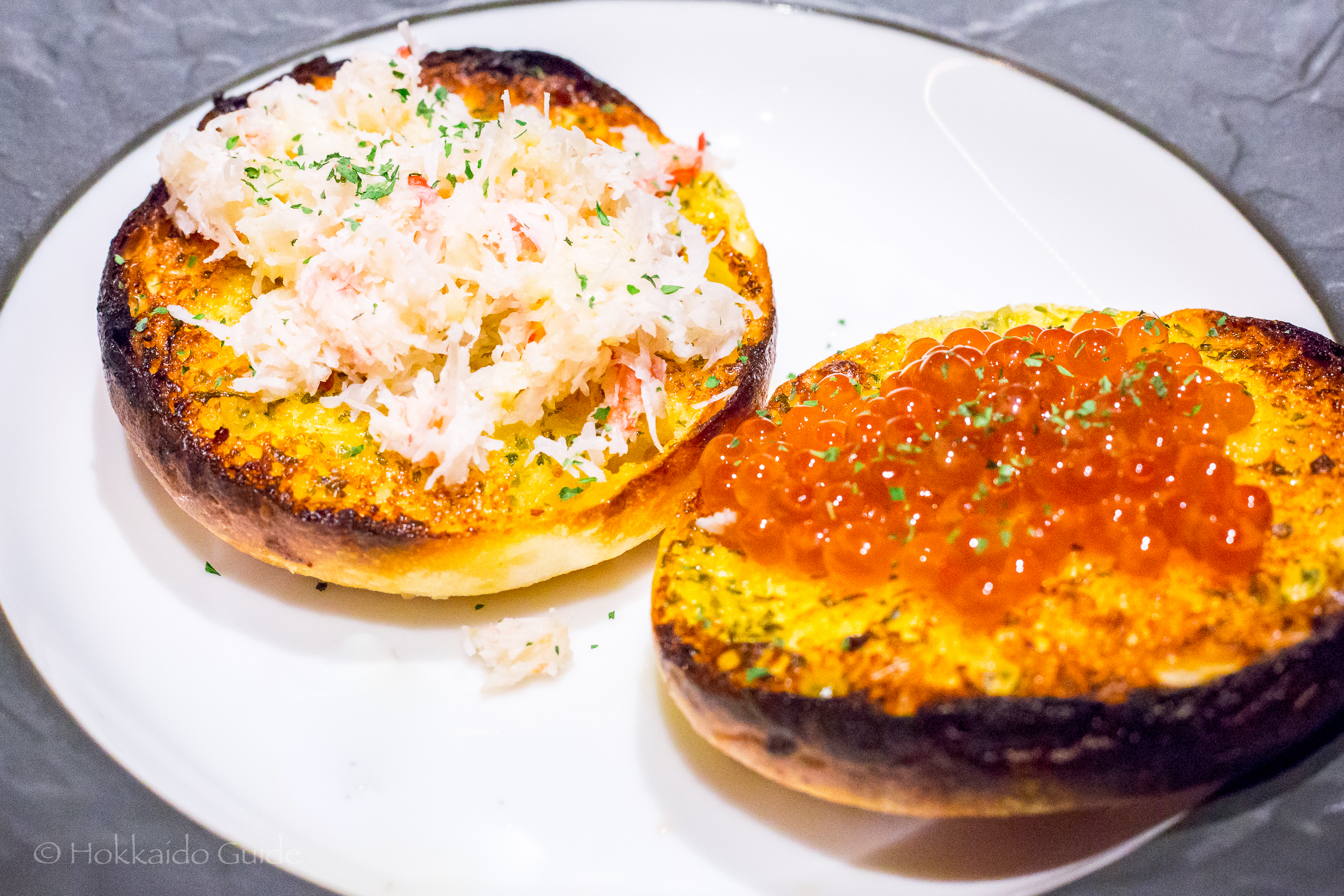 Fish eggs on garlic bread