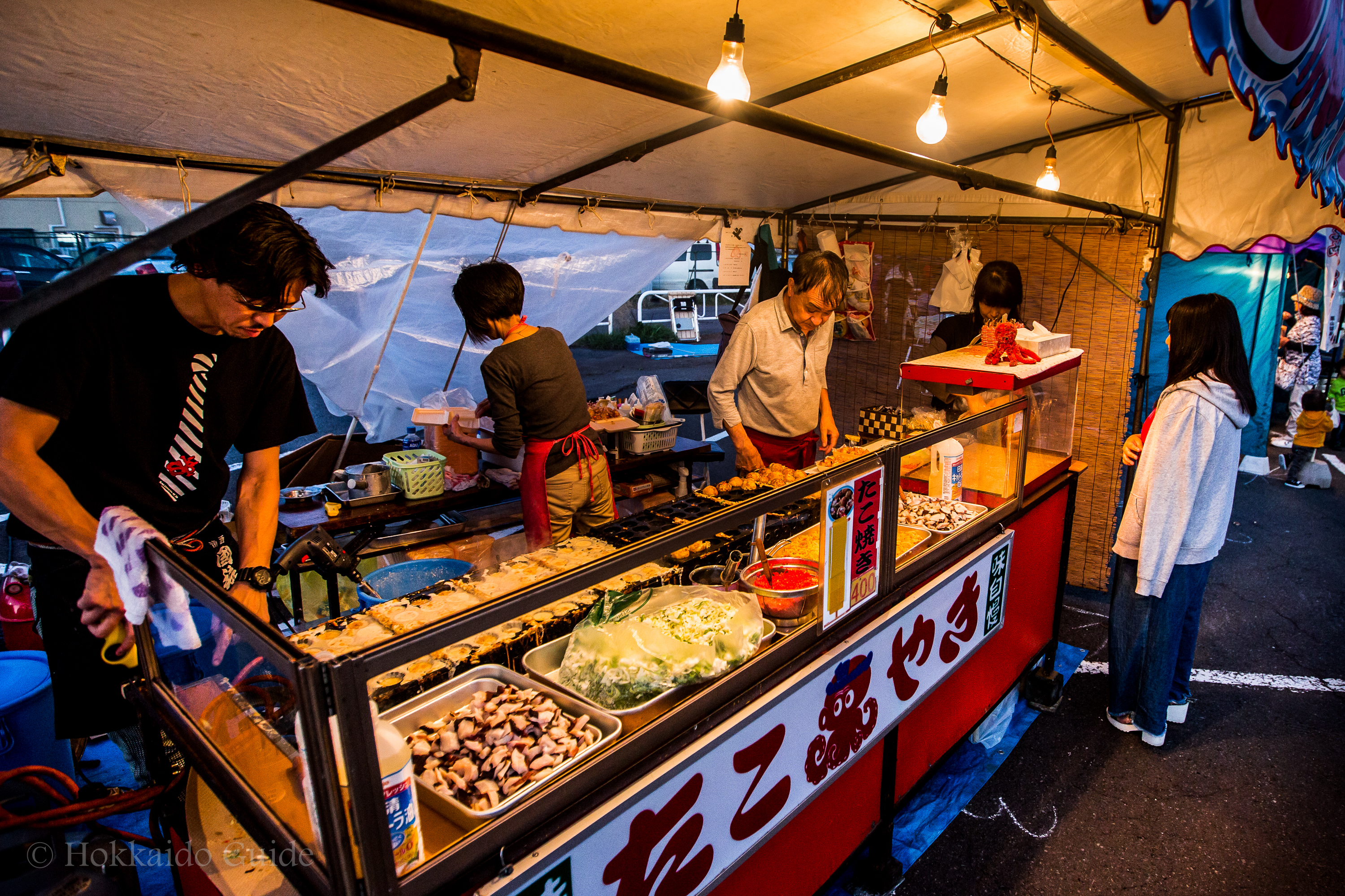 For the meat eaters in town, the 10 chome site is well worth a look! Here, you can enjoy a huge selection of meats, including venison steaks, as well as crackling pork, chicken and beef. Famous wild game shops have set up their stalls which are enough to satiate any meat lover! Desserts and salads are available to compliment these dishes. There is also a beer stall set up in the middle.