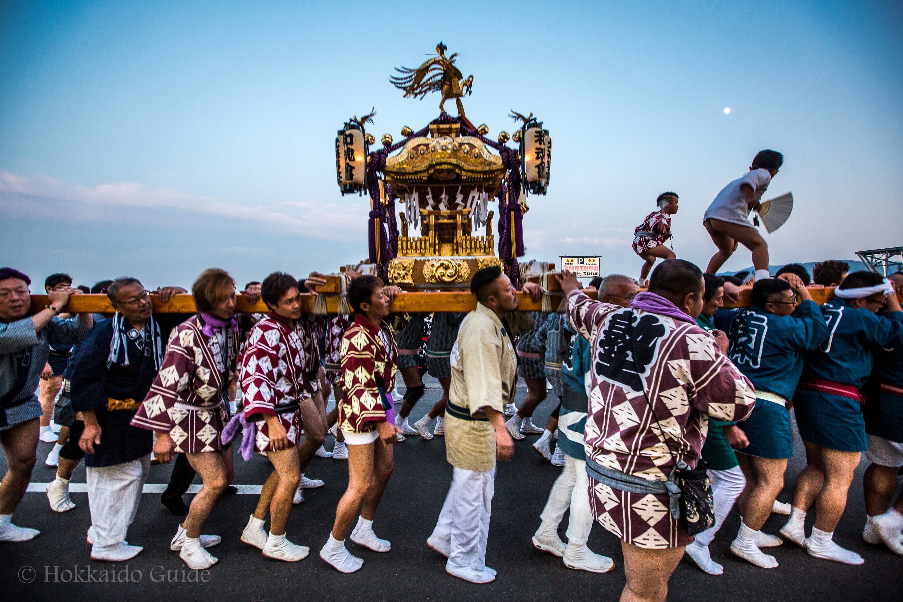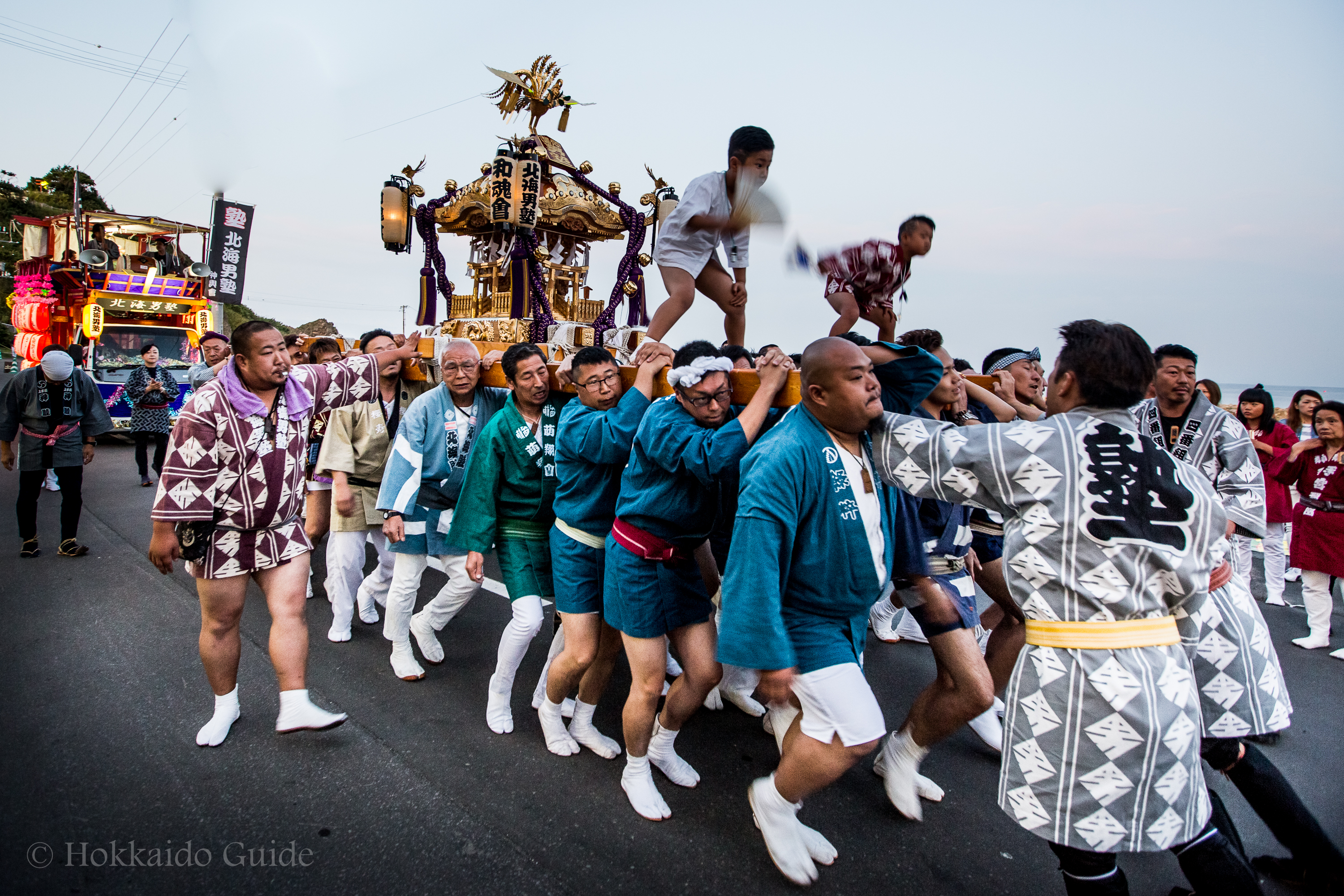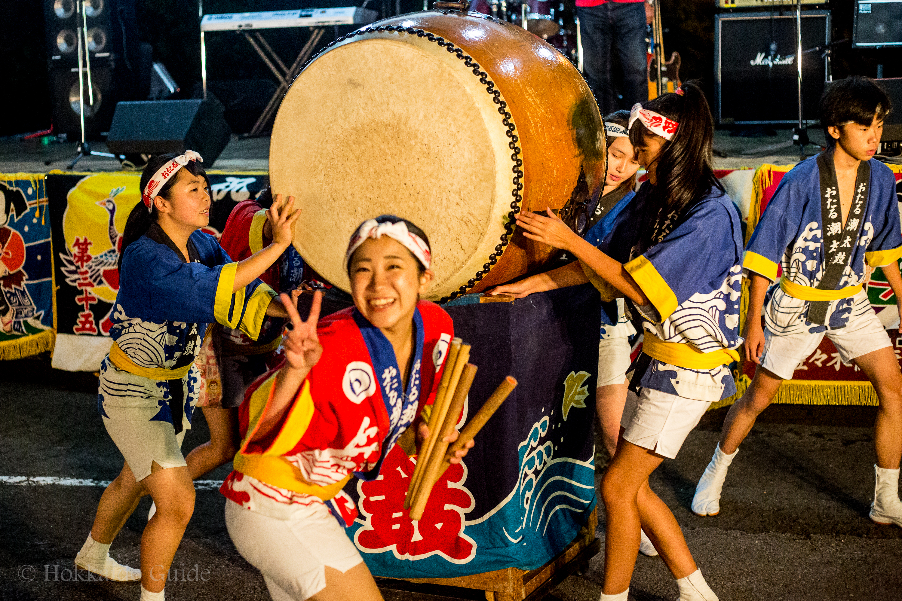 At the start of the festival a portable shrine (mikoshi) is carried in by a large group of participants. These group of shrine bearers get together every year, and are from Sapporo and a few outlying towns. Chanting and singing to the rhythm the shrine is slowly brought into the festival. Once the shrine is in the festival it is placed in front of a dozen Taiko performers hitting the drums in time with the chanting. The drums with the shrine gives this festival a great Japanese atmosphere!