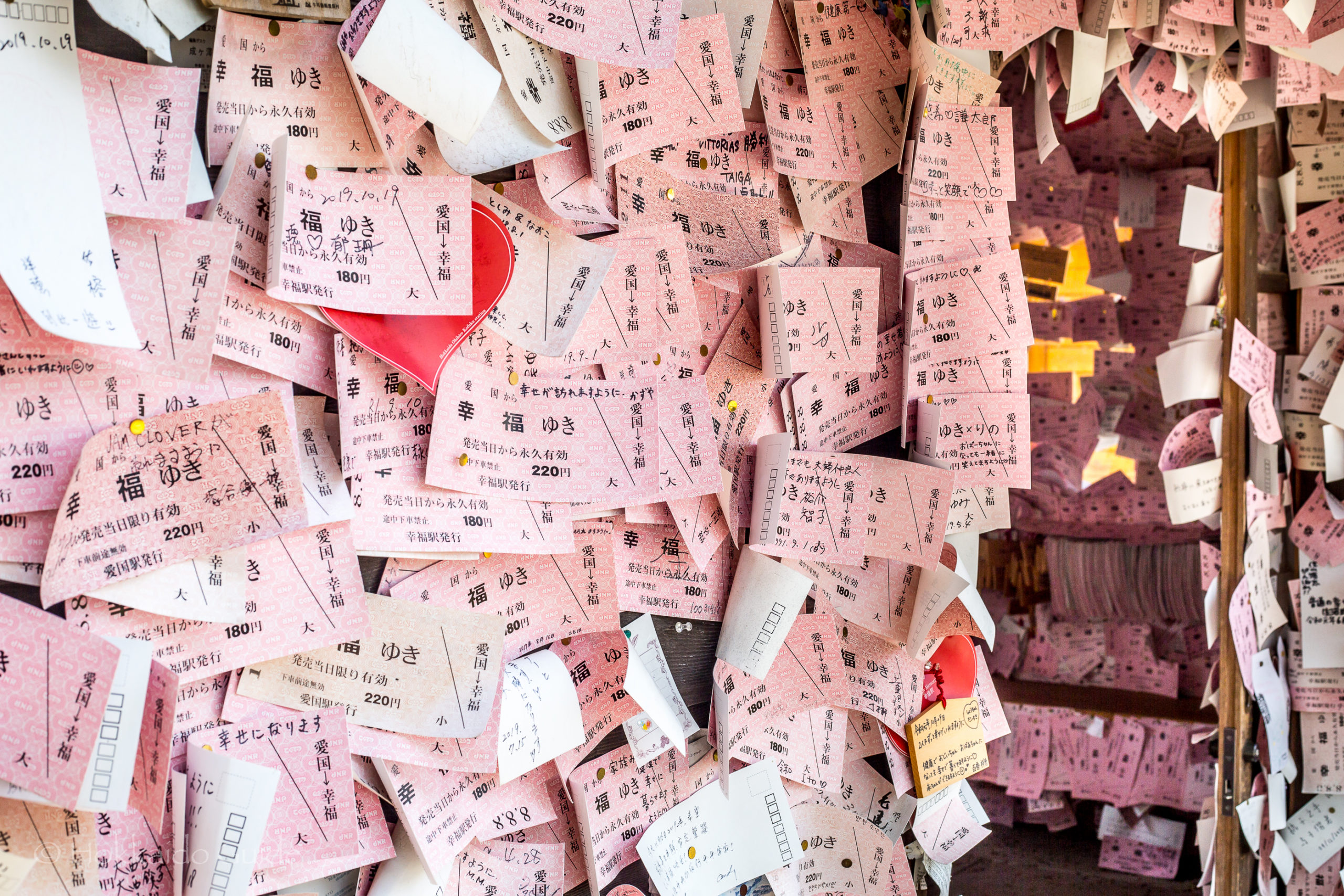 Kōfuku Station is part of Kōfuku Kōtsu Park. In this area, there is a nice little coffee shop, plus a small souvenir store (the Kōfuku train ticket is a very popular item), and photography area. There are two old trains here that have been turned into small museums. This area is especially popular for couples as the site was chosen as a ‘Sanctuary for Lovers’ in 2008. There is a special bell here that can be rung for good luck, plus the main attraction is the small hut here. You can write a message on a pink ticket and stick it to the wall. The hut is covered with thousands of these messages. Kōfuku Station is a popular spot to visit, if you can get out that way.